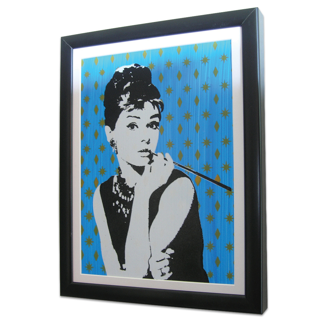 This retro design of the "Shopper" Audrey Hepburn was done on a washed canvas with blue acrylic paint. The gold sparkle pattern and the negative of Audrey were burned onto screens.