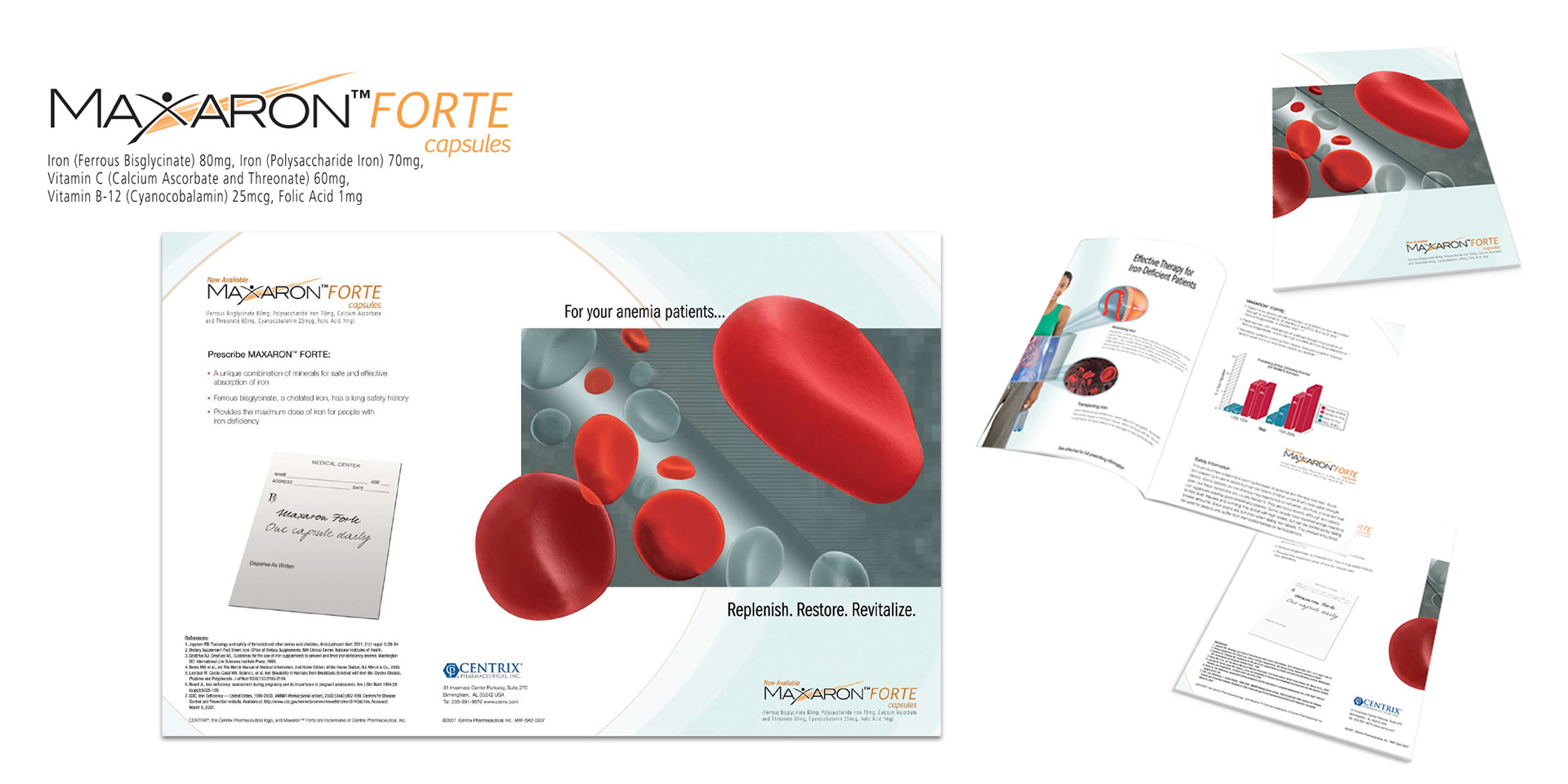 A specialty pharmaceutical company based in Birmingham, Alabama approached us with a challenge. Help them launch a new prescription-strength iron supplement brand. The primary target audiences were OB/GYNs and primary care physicians. The budget was limited. Our objective was to develop a concept that emphasized the science behind the product. I focused on simplifying the complex science to the product level — rebuilding red blood cells. I selected a couple of royalty-free images of red blood cells, then used Photoshop to manipulate the images and create depth.