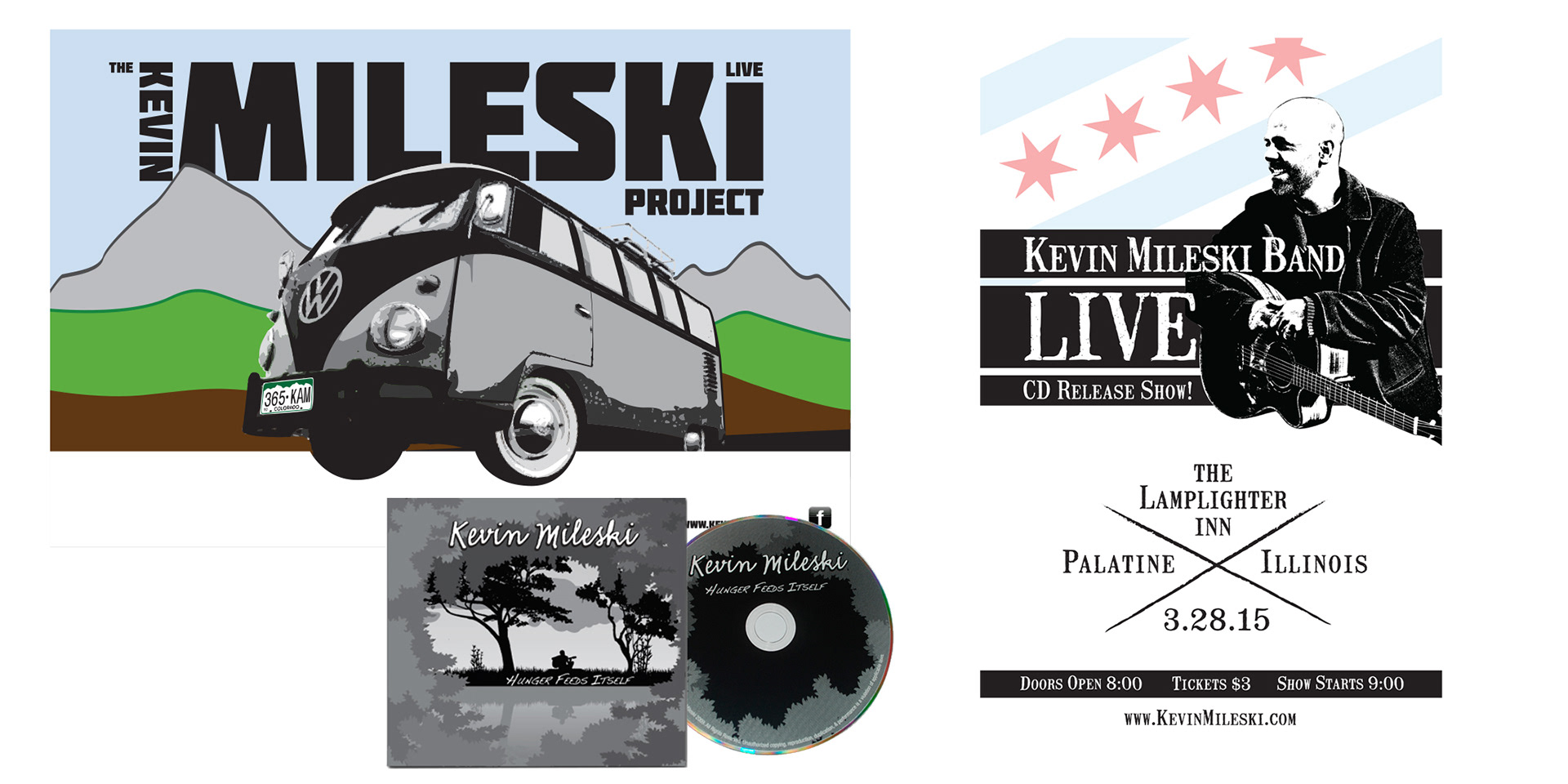 Some of my favorite creative work has been for one of my long-time friends, singer/songwriter/musician Kevin Mileski. Throughout the years of designing albums and show posters on a tight budget, we've collaborated ideas that have inspired these designs.
